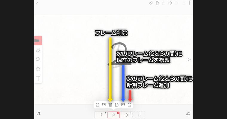 赤矢印部分が現在選択中(描いている)フレームになります。黄矢印部分をタップすることで、フレームが追加されます。